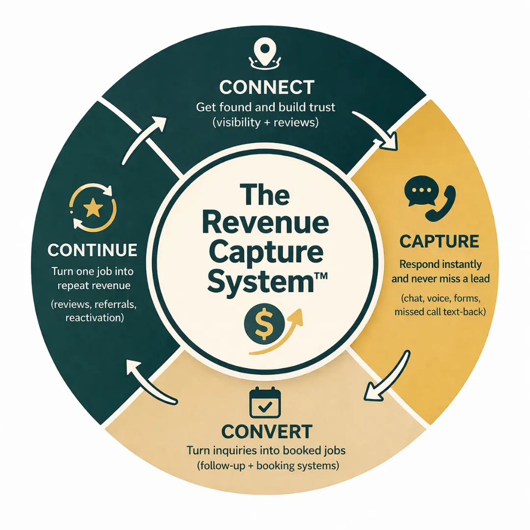 We run targeted Facebook Ads to generate awareness and interest, and help you leverage Google Local Service Ads to capture high-intent prospects actively searching for your services. Then we connect it all to your Revenue Capture System™ so more leads turn into booked jobs for your company.
